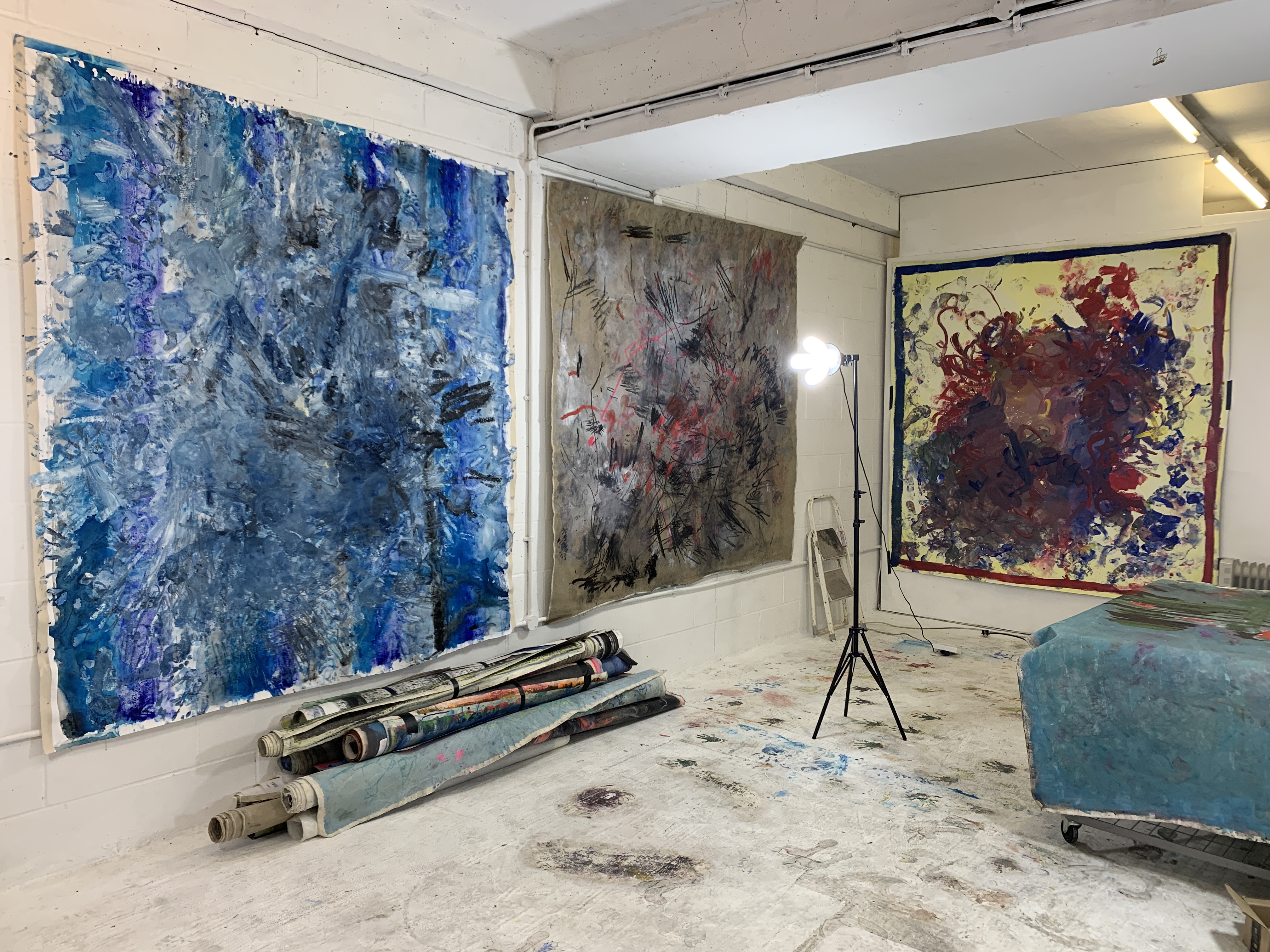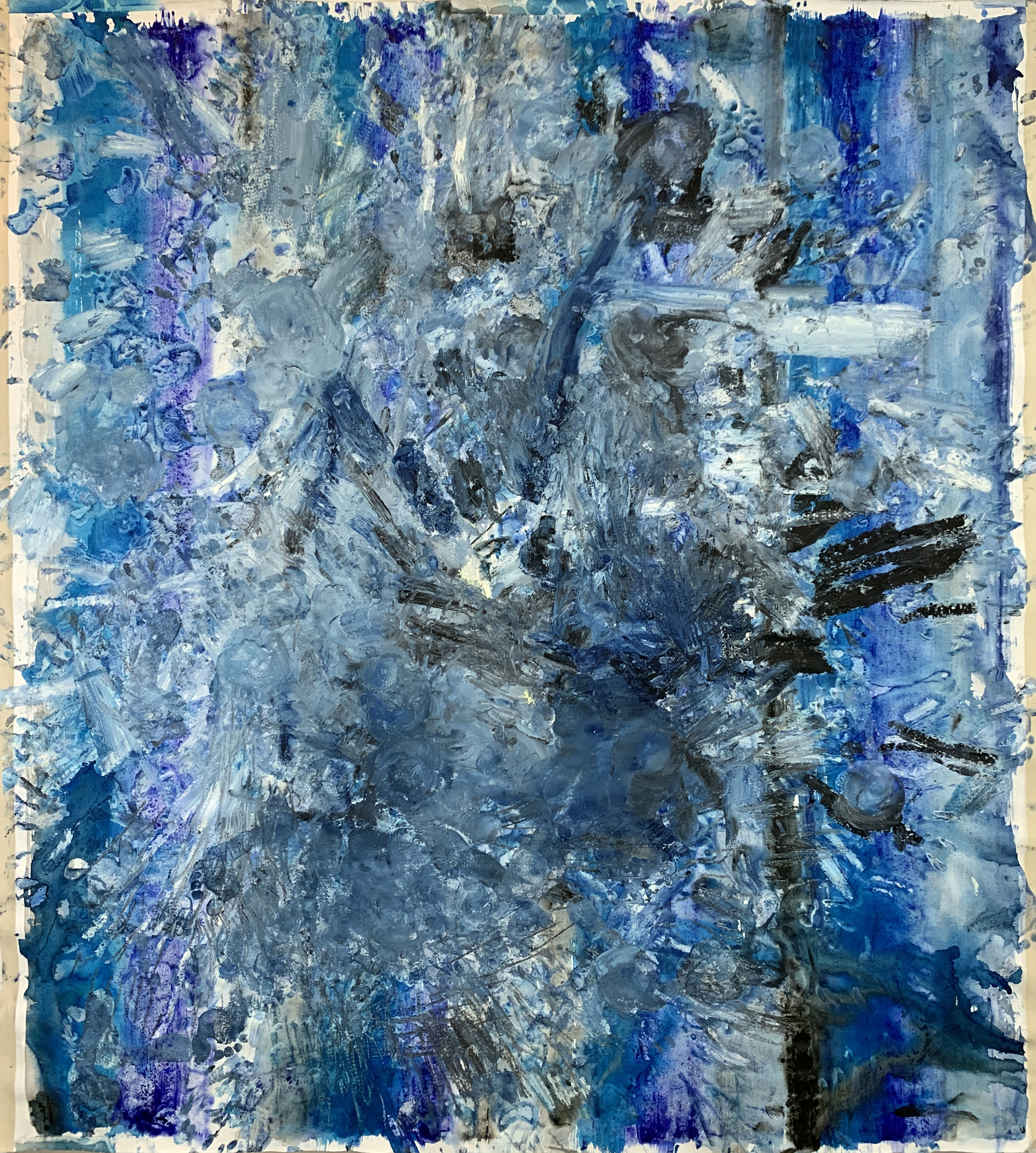 This work was painted without sight while listening to a piece of recorded music by Steve Reich called Music for Eighteen Musicians.