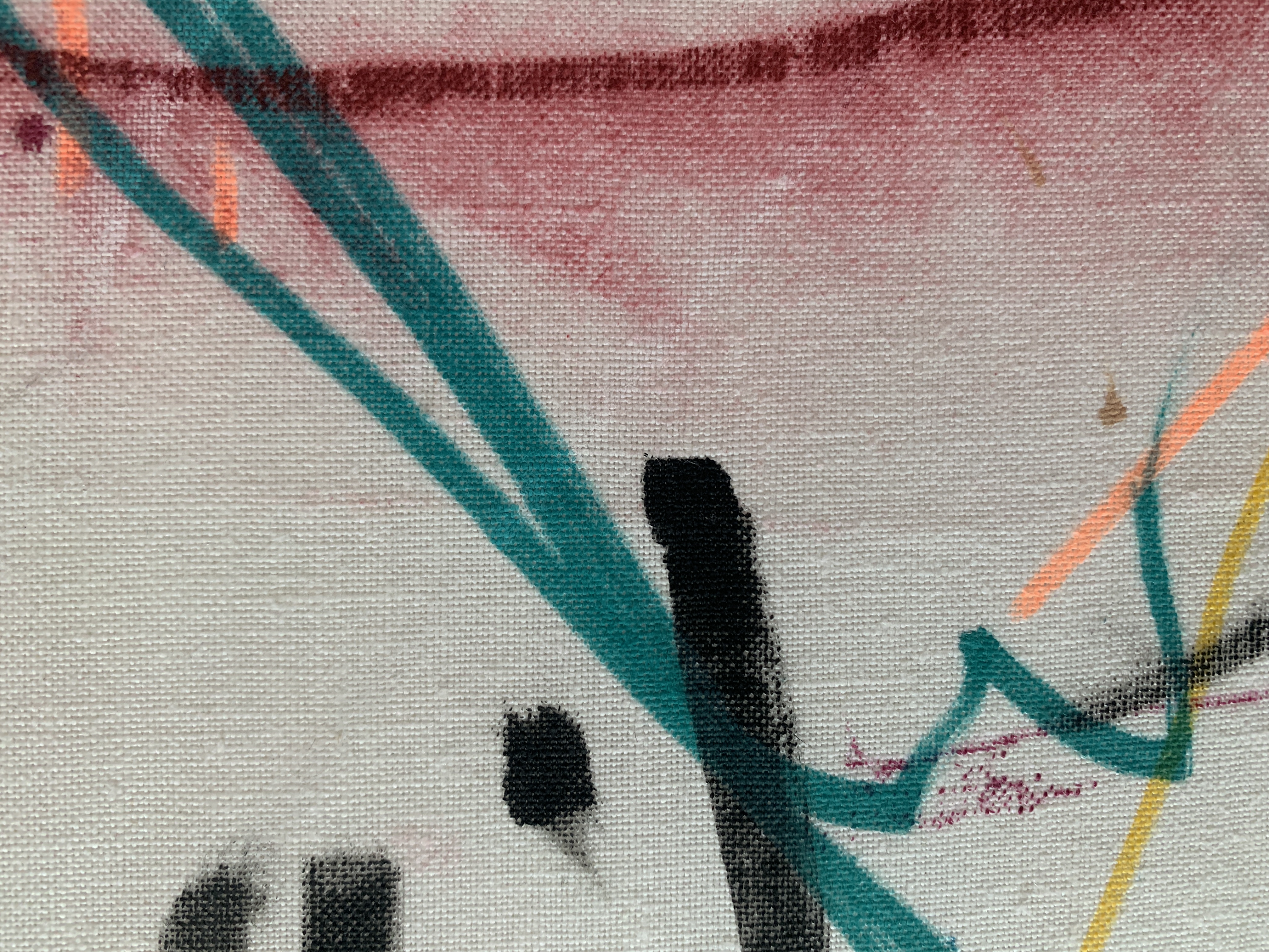 5am examines the spatialization of time and body memory in performance painting. The temporal aspect of this work, performed as one continuous motion, exposes distinctions between conceptual time and real time in relation to the process of painting. Claire Zakiewicz was blindfolded during the process while a collaborator made each colour decision by giving her coloured inks and influencing her position on the linen by clapping his hands for her to follow.