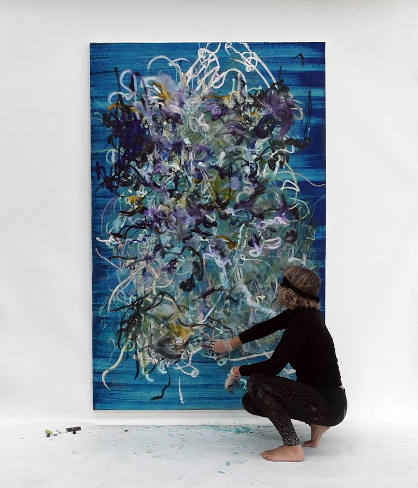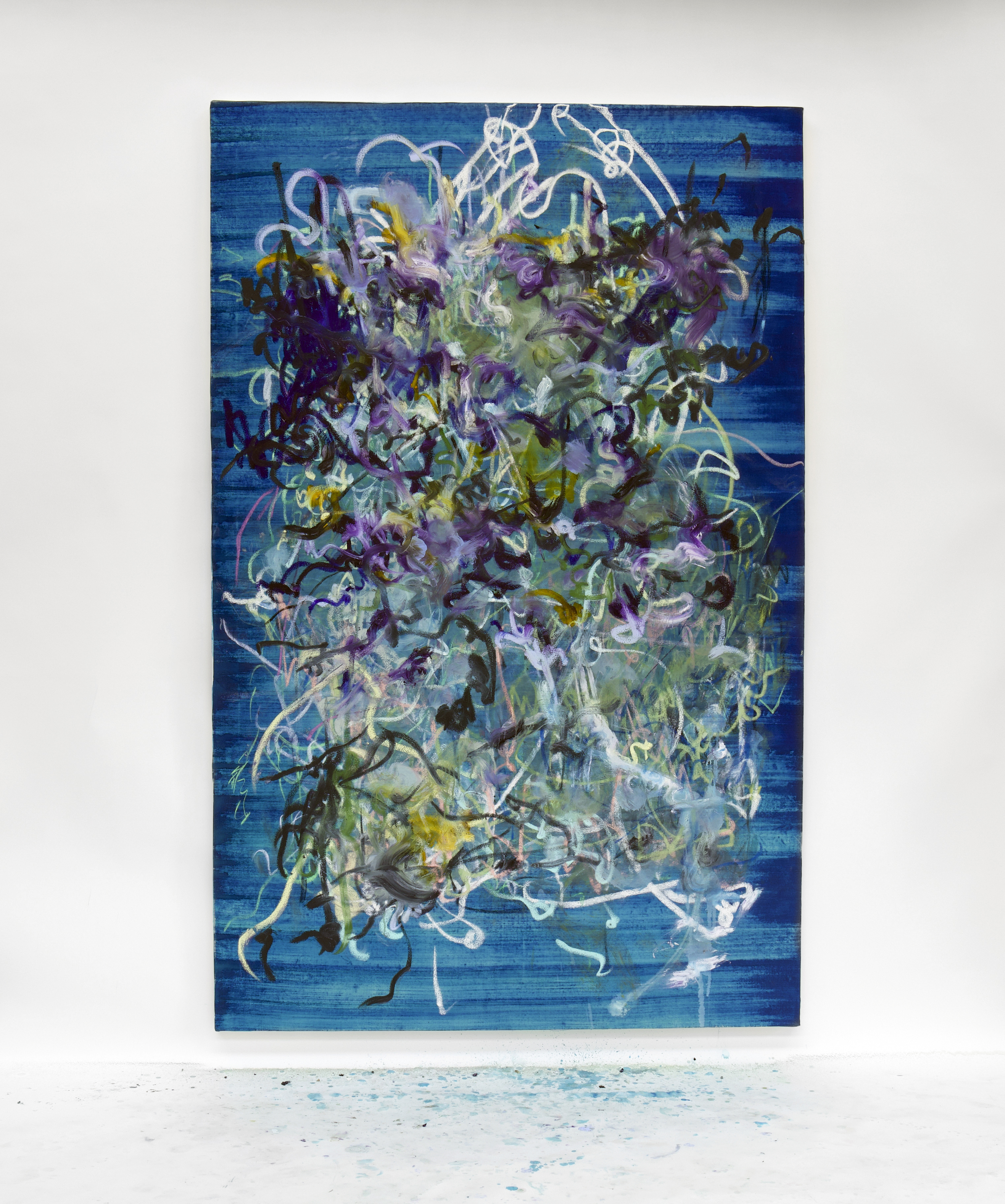 This work is the result of a performance combining automatic writing, active imagination, and contact improvisation into a continuous, embodied action. Working blindfolded on the canvas, I explored balance, tension, and resolution through a range of gestural mark-making.