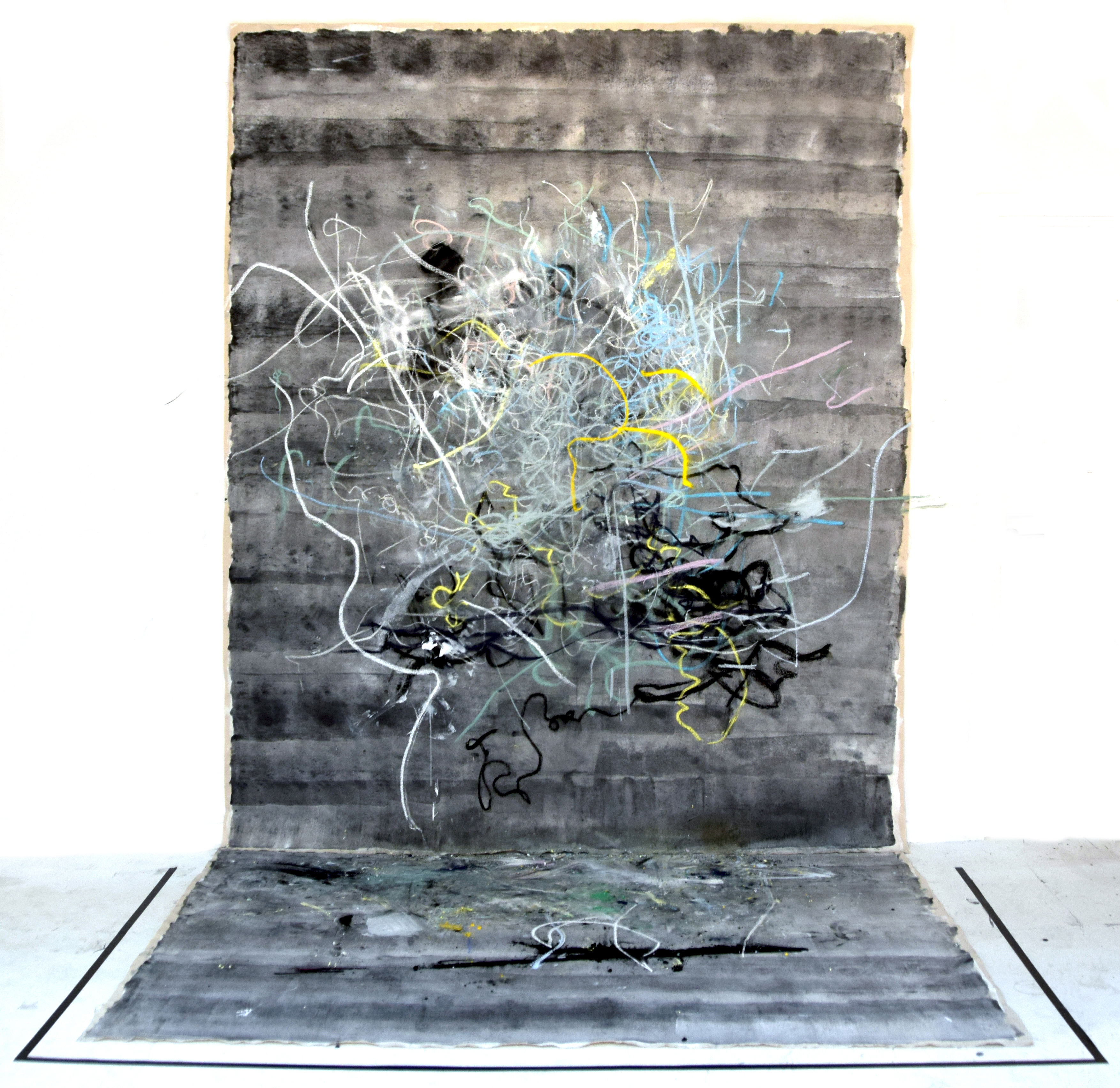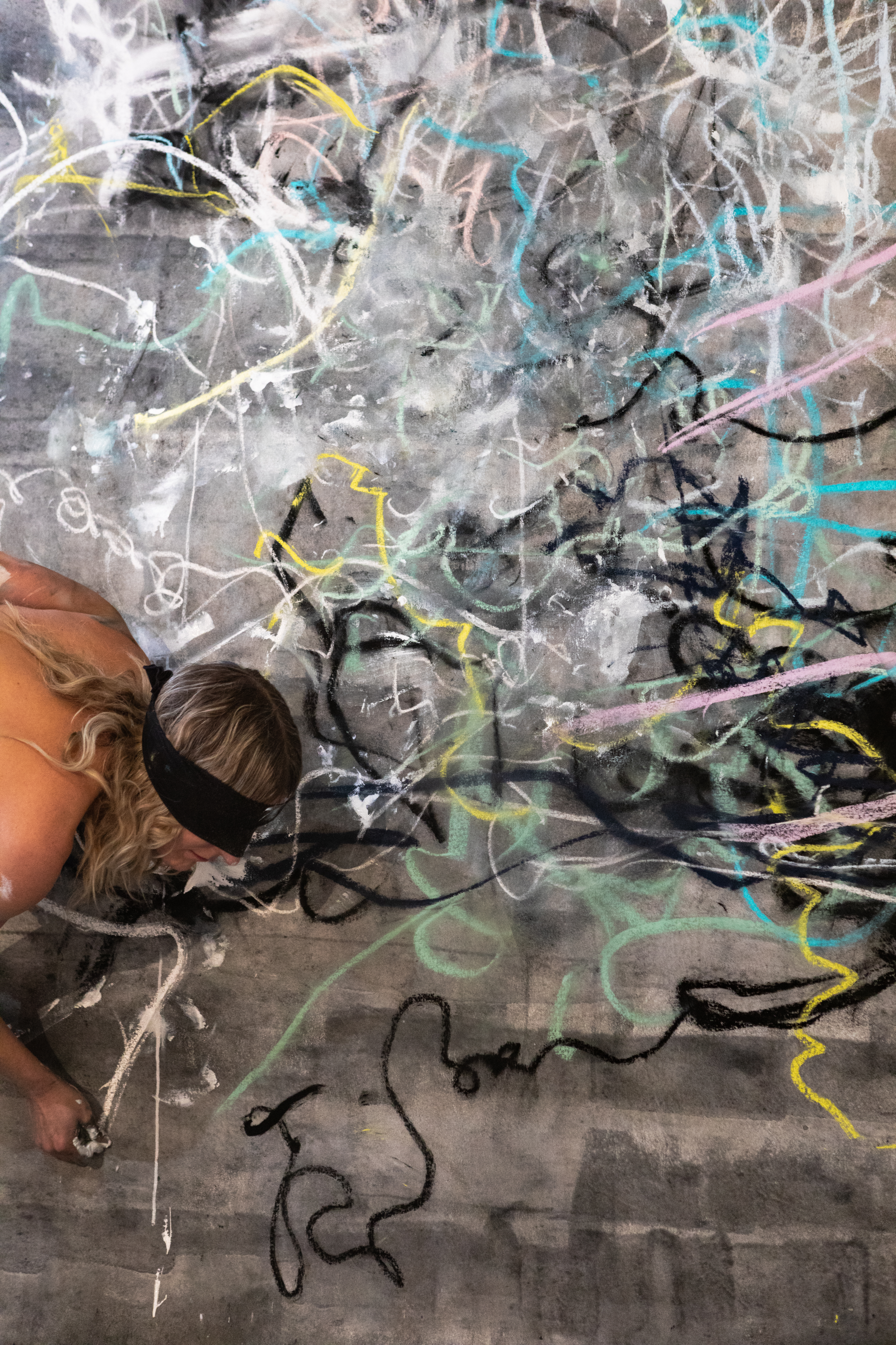 "For this performance I worked with @rubydreww, a talented young musician and performer who improvised with samples taken from my studio with live electronics. We responded to each others visuals and sounds in real time to produce this work, which is pastel, graphite and gesso on canvas."