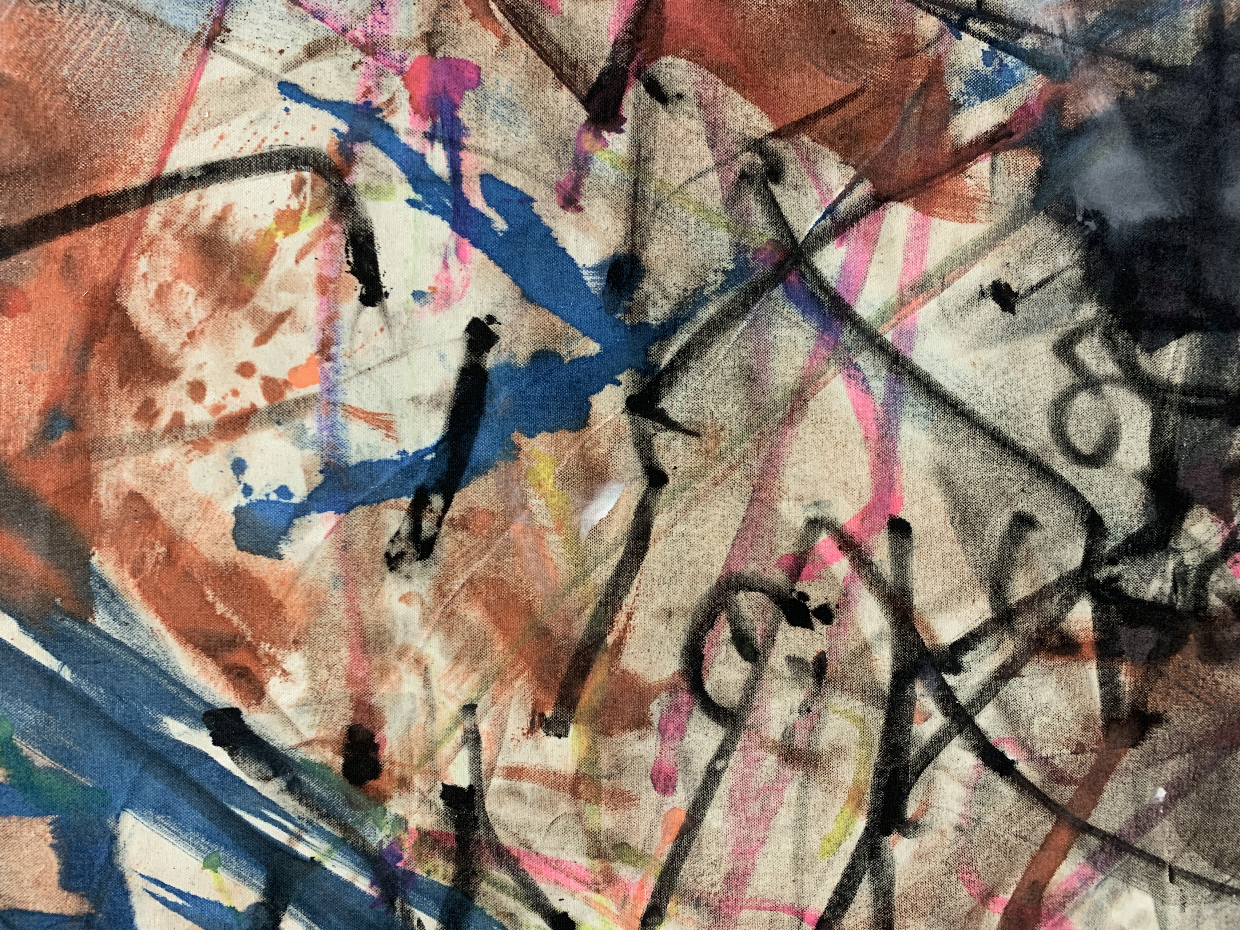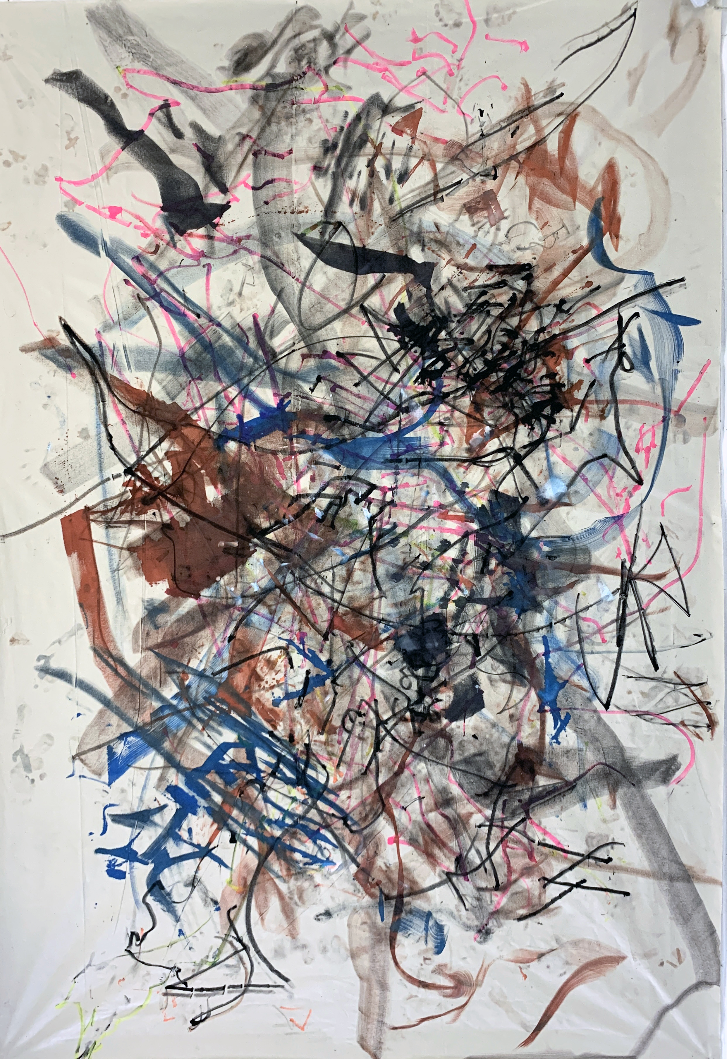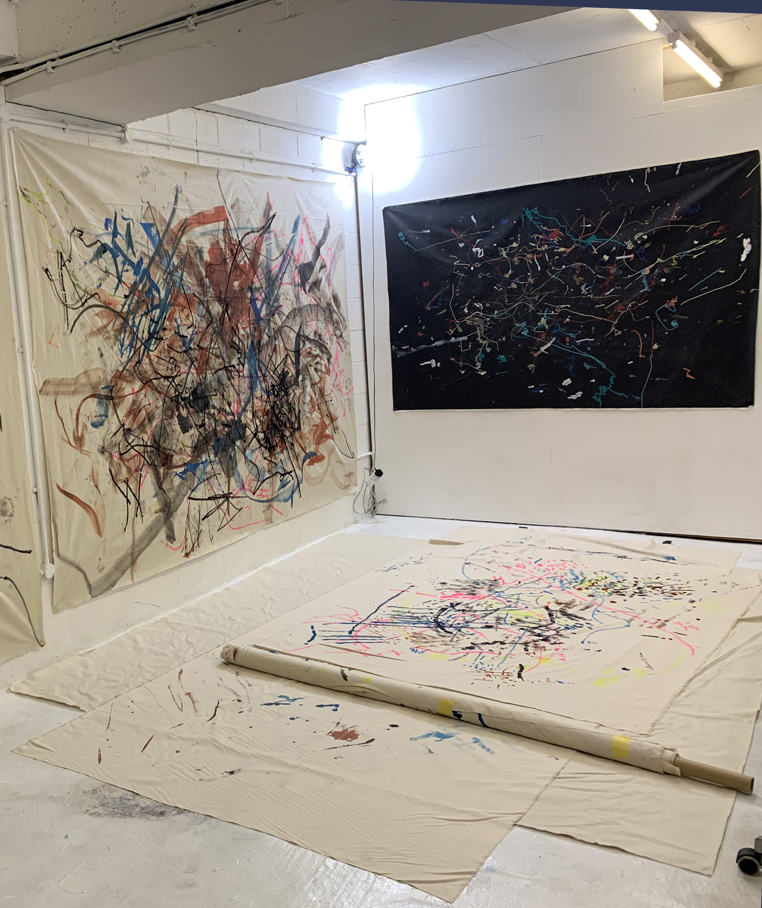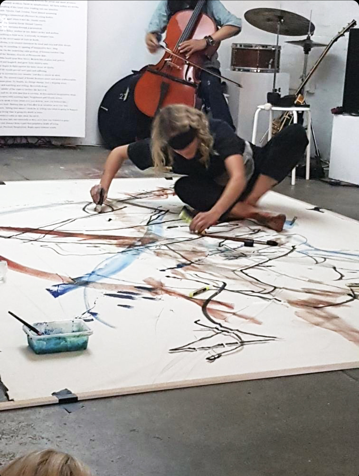 Some Loose Assemblies 2 took place at Hundred Years Gallery, Hoxton, London, in July, 2021. As its title suggests, this event was the second (of three) based on the theme of live performances and projections of that explore the relationship between different art forms in order that there should be real-time cross-fertilisation between them. The events were curated by visual artist Claire Zakiewicz, who had incorporated live music into her practice of performance painting for many years. She has explored one-way responding to music or vice-versa, as well two-way interaction. She has written of the interaction between the mediums: “When drawing music, the tension and movements affect the mark-making directly, and so minimal yet dramatic music is a good combination”.