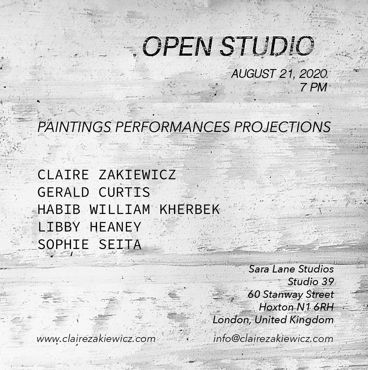 7:30pm daily: Claire Zakiewicz (NYC, USA/ London, UK), Itinerant