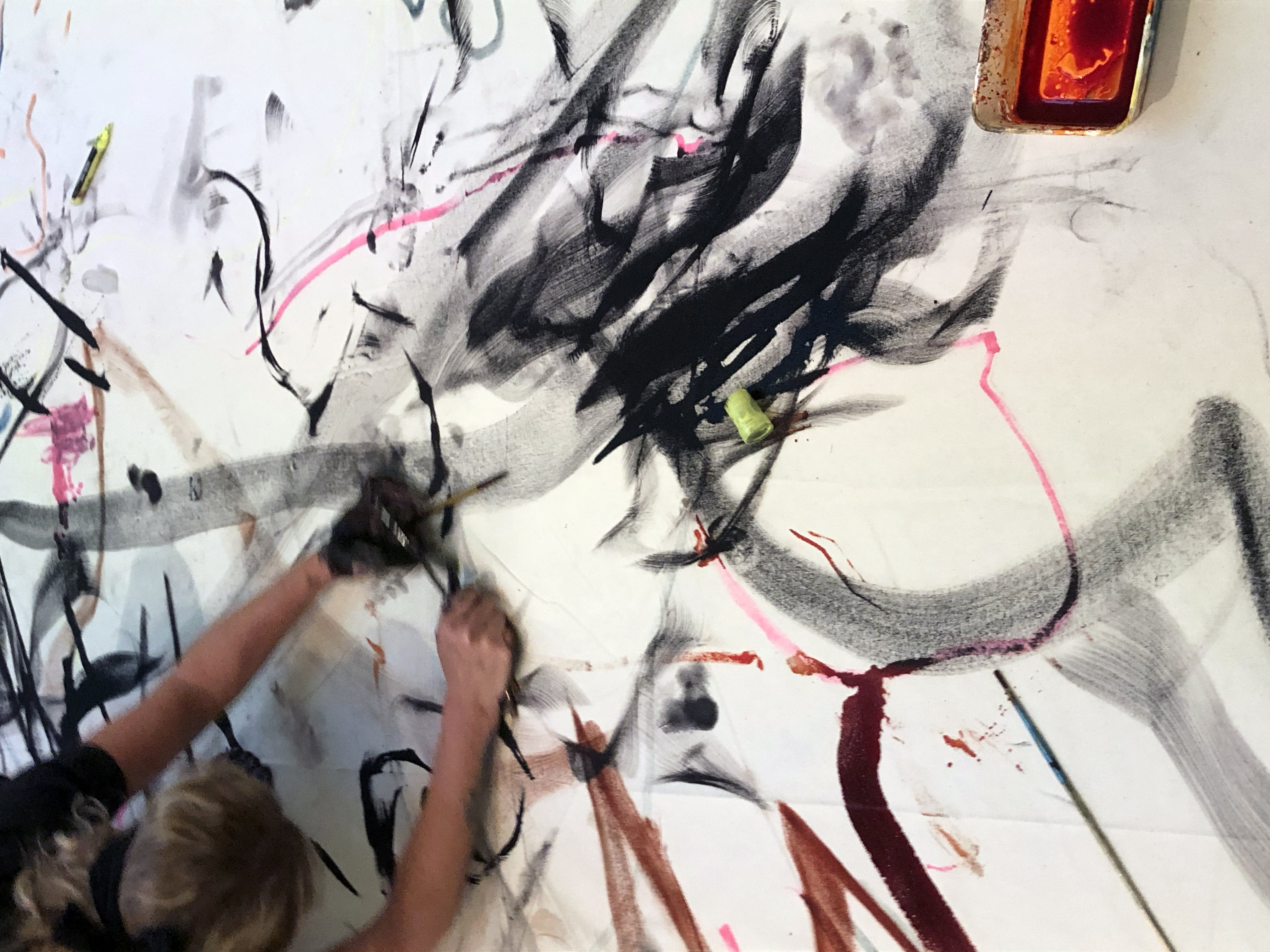 Claire Zakiewicz is an interdisciplinary artist working in both London and NYC. She is interested in the (meta)physical relationships between sound, drawing, movement, how we read drawings and the processes that underlie our emotional relationship with art. Mostly working with performance painting, Zakiewicz often works collaboratively and uses dance and acting methods as part of her drawing and painting practice. She has a background in improvised music and drawing as well as composition and inter-disciplinary scores. She contributed a chapter describing her drawing practice for the volume Aesthetics of Imperfection: Spontaneity, Flaws and the Unfinished (Bloomsbury), 2020. website: www.clairezakiewicz.com
